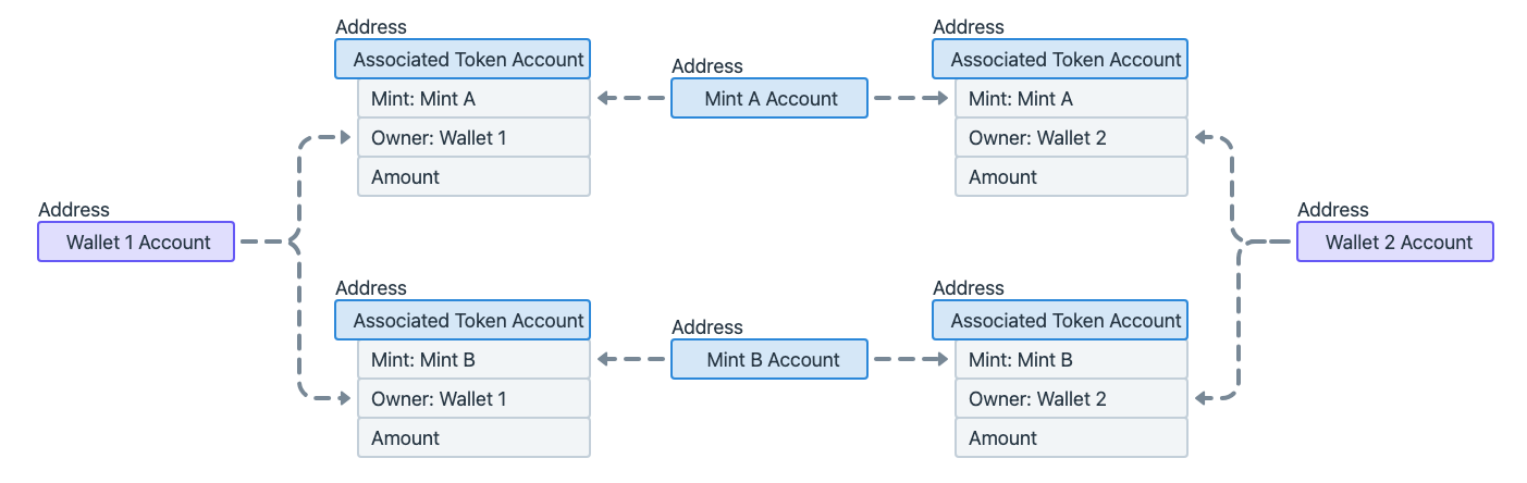 - Associated Account (PDA): An Associated Token Account is a token account created using an address derived from the address of the owner and mint account.